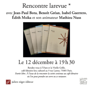 - 12 décembre 2025 : lecture de textes parus dans larevue*, à la librairie l’Ours et la Vieille Grille